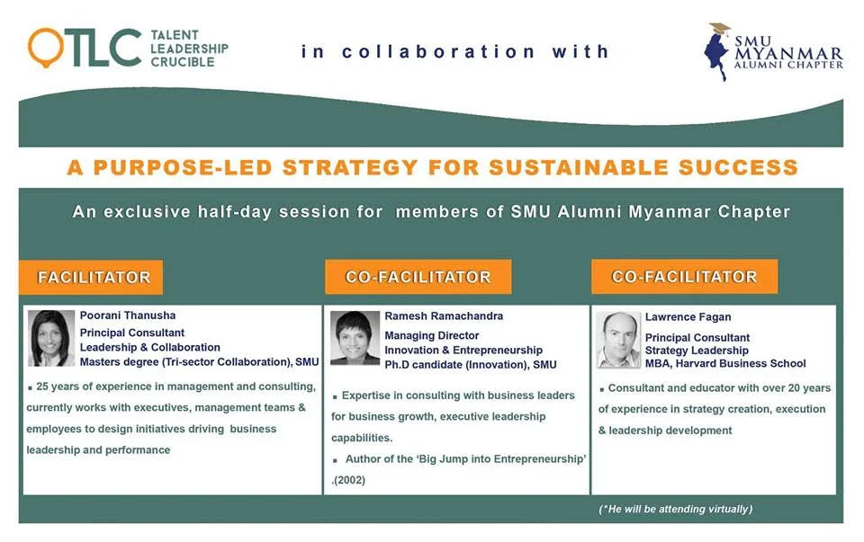 On 18 November 2017, SMU MAC has planned an interactive workshop titled Purpose-led Strategy for Sustainable Success. It was jointly organised by SMU MAC and TLC Asia at Taw Win Garden hotel in Yangon, Myanmar. The workshop was well-participated, fully signed up and successful. It was great learning and networking opportunity for everyone. We aim to organise more of such fruitful events in future.
